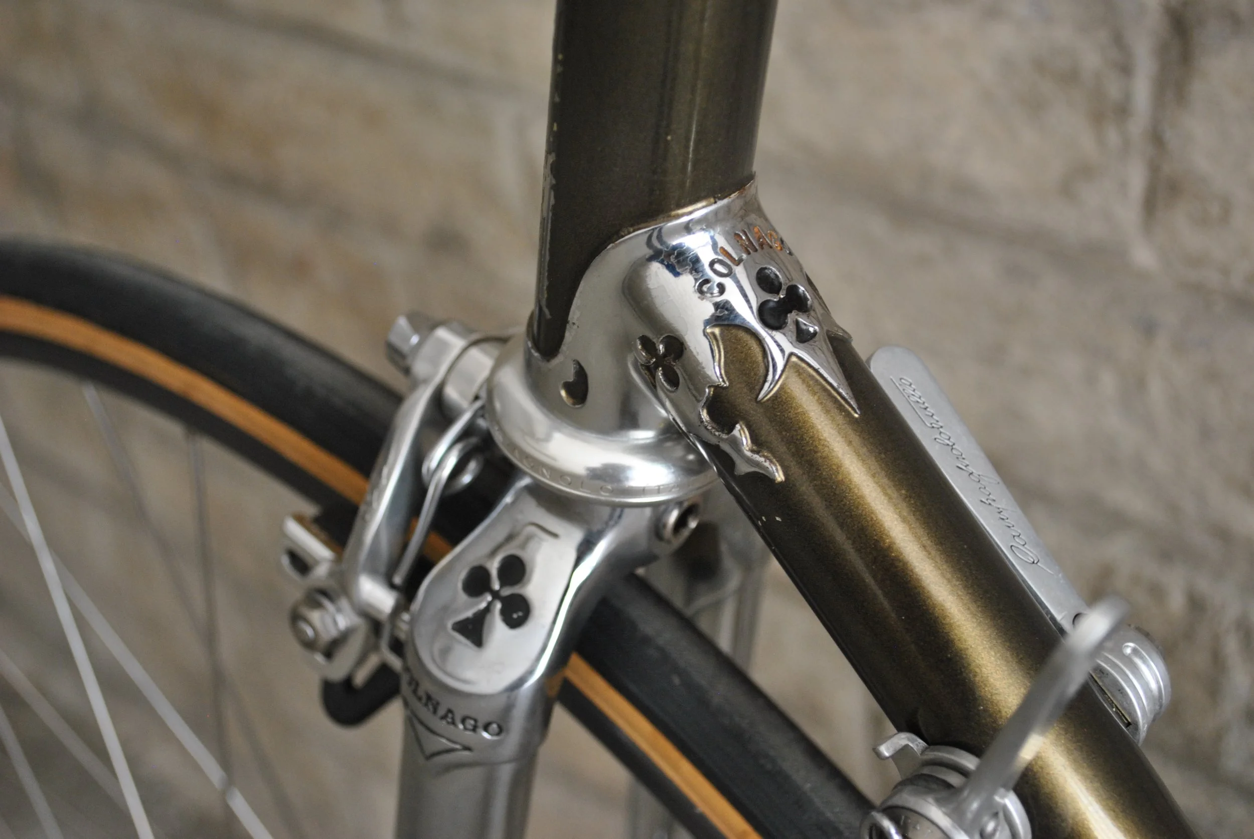 Der Rahmen wurde in diesem Fall mit der zeitlich passenden Campagnolo Jubiläumsgruppe aus 1983 aufgebaut, welche 1984 immer noch gerne verbaut wurde. Hier treffen also 2 limitierte Jubiläumsausgaben aufeinander- beide mit vergoldeten Details. Außerdem wurde ein gravierter 3TTT Vorbau inklusive speziellem Colnago Lenker verbaut. Abgerundet wird das Rad durch eine NOS Colnago Trinkflasche inklusive Colnago Flaschenhalter, welcher für dieses Modell auf den Markt kam.